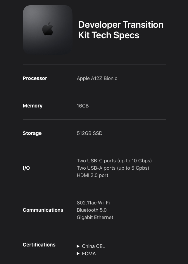 Developer Transition Kit 就是這方案的其中一元,是一個全新 Mac Silicon 的硬體開發平台,當中包含以 Mac Mini 模式包裝的主機,主要有以下配套:
