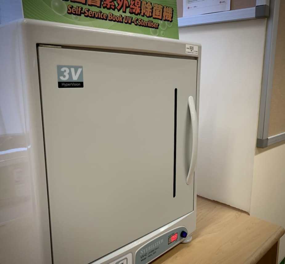為加強抗疫,圖書館亦安裝了自助紫外線除菌機,只需把圖書放入並作 V 型排列,按制後約40秒便完成消毒。