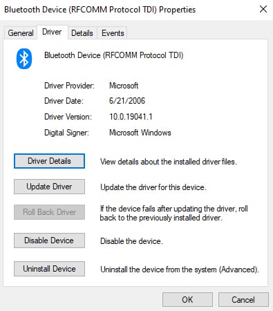 Highlight the Bluetooth Device (RFCOMM Protocol TDI) device. Click on the right mouse button and select the Driver Tab. Perform “Update Driver” to make sure the latest driver software is installed.