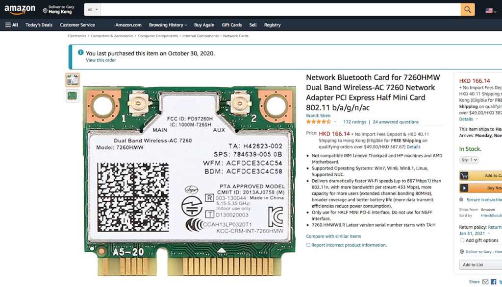 剛巧早幾天要在 Amazon 作網購,便添置了一塊 Intel 相容 Wifi 網絡卡為我的 NUC 升級。