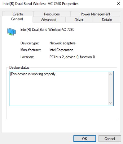 Execute the Windows 10 Device Manager to review the status of the Bluetooth Device (RFCOMM Protocol TD) and the Intel(R) Dual Band Wireless-AC 7260 devices.