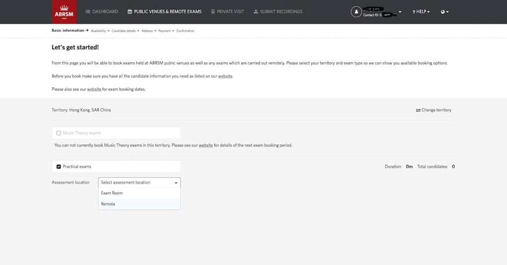 Once the user account was created, you needed to login to portal.abrsm.org to continue with the online booking.