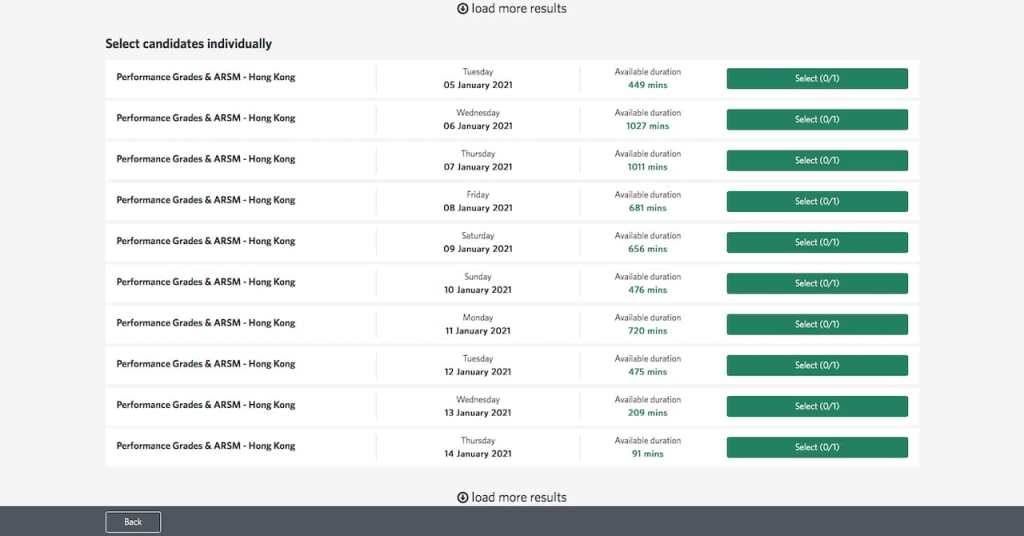 在 “Select candidates individually“畫面,按下 “Select (0/1)” 選擇所需遞交時段。留意所選的剩餘時間 (Available duration)需多於評級所需時間。