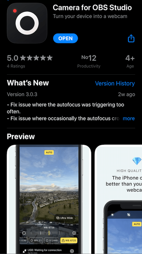 Next install OBS Camera Plug-in in OBS Studio and add the new “IOS Camera” source.