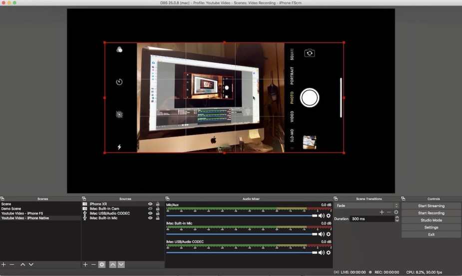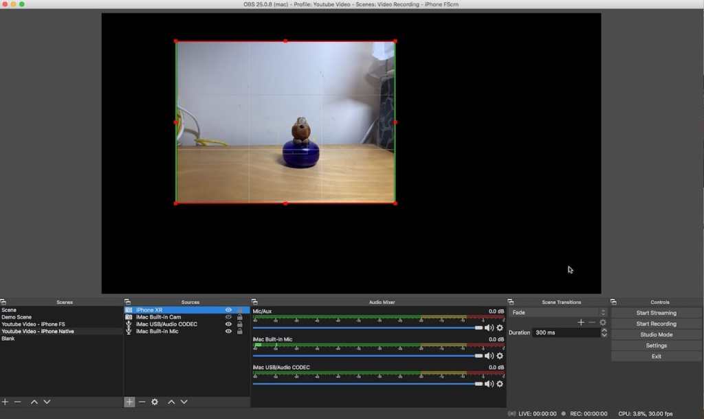 First create a new OBS Studio Scene. Add audio input for the iMac USB Audio CODEC (Guitar-to-USB interface) and video inputs for the iMac Webcam as well as the OBS Camera Plug-in for my iPhone Camera.