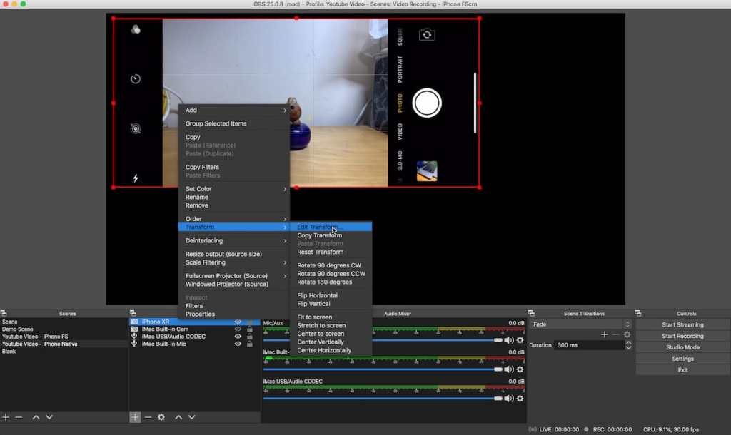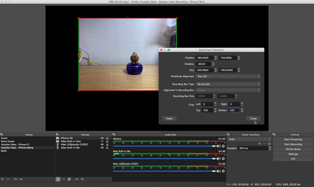 方法很簡單,只要在 OBS Studio 內的相關 Window Source 或 iPhone Source 上選取 “Edit Transformation”,改變 “Crop values” 或按 “Resize” 鍵 ( Control-T under macOS),再移動畫面上的綠色框架便可。