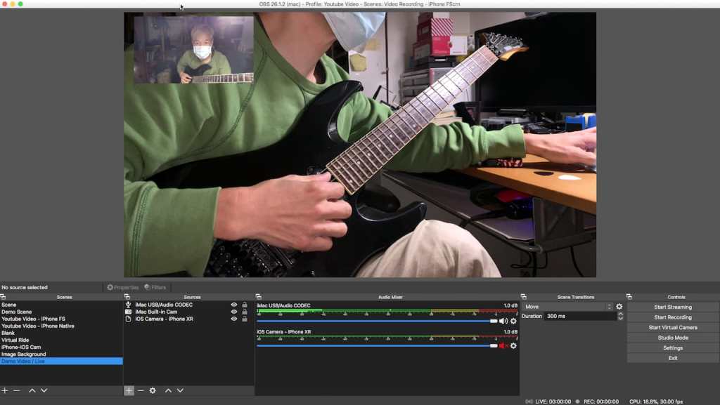 The setup I used to recording the following instrumental demo is consisted of the Camera for OBS Studio App running on my iPhone XR, the built-in iMac Webcam (second video source) and my Behringer UCG102 compatible Guitar-to-USB interface.