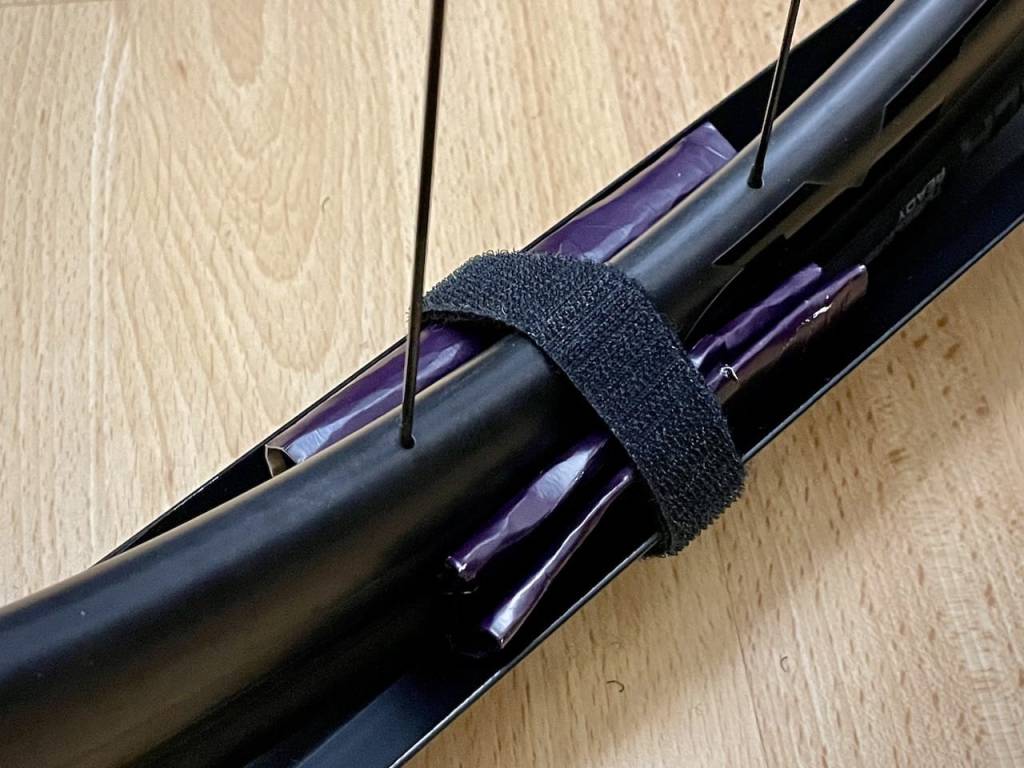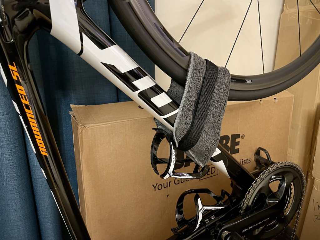 Finally, secured the front wheel to the bike down tube using the supplied velcro strap. A piece of microfibre cloth was added to protect the carbon front wheel and the frame coating from any unnecessary damage.