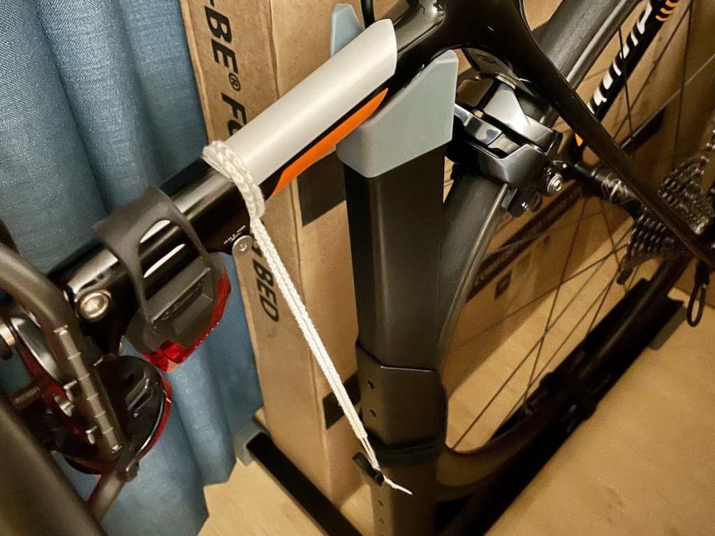 As Bike Nook supports both Road Bikes and Mountain Bikes (MTB), the ramp seems to be much wider than most of the thin road bike tyres. I used two other velcro straps (Bike Nook only came with one for tying of the front wheel) to tighten the rear wheel. By inserting cardboard papers on the two side of the rear wheel, a more stable mounting was achieved.