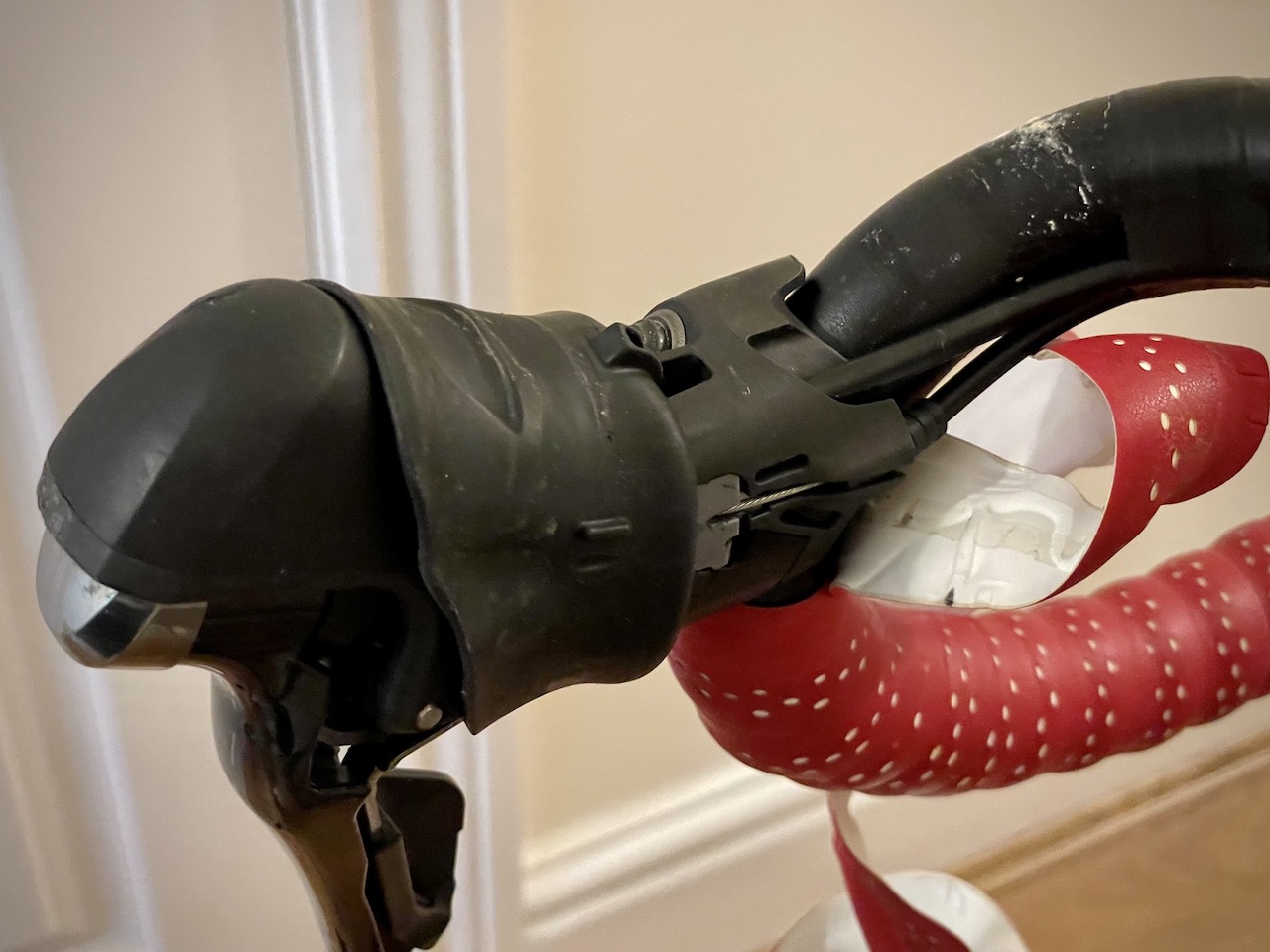 To swap the front and rear braking function among the two STI controls, I had to properly cut and replace the two brake cable housing. As such, un-wrapping of the handlebar tape to reveal the underlying brake cables was also required.