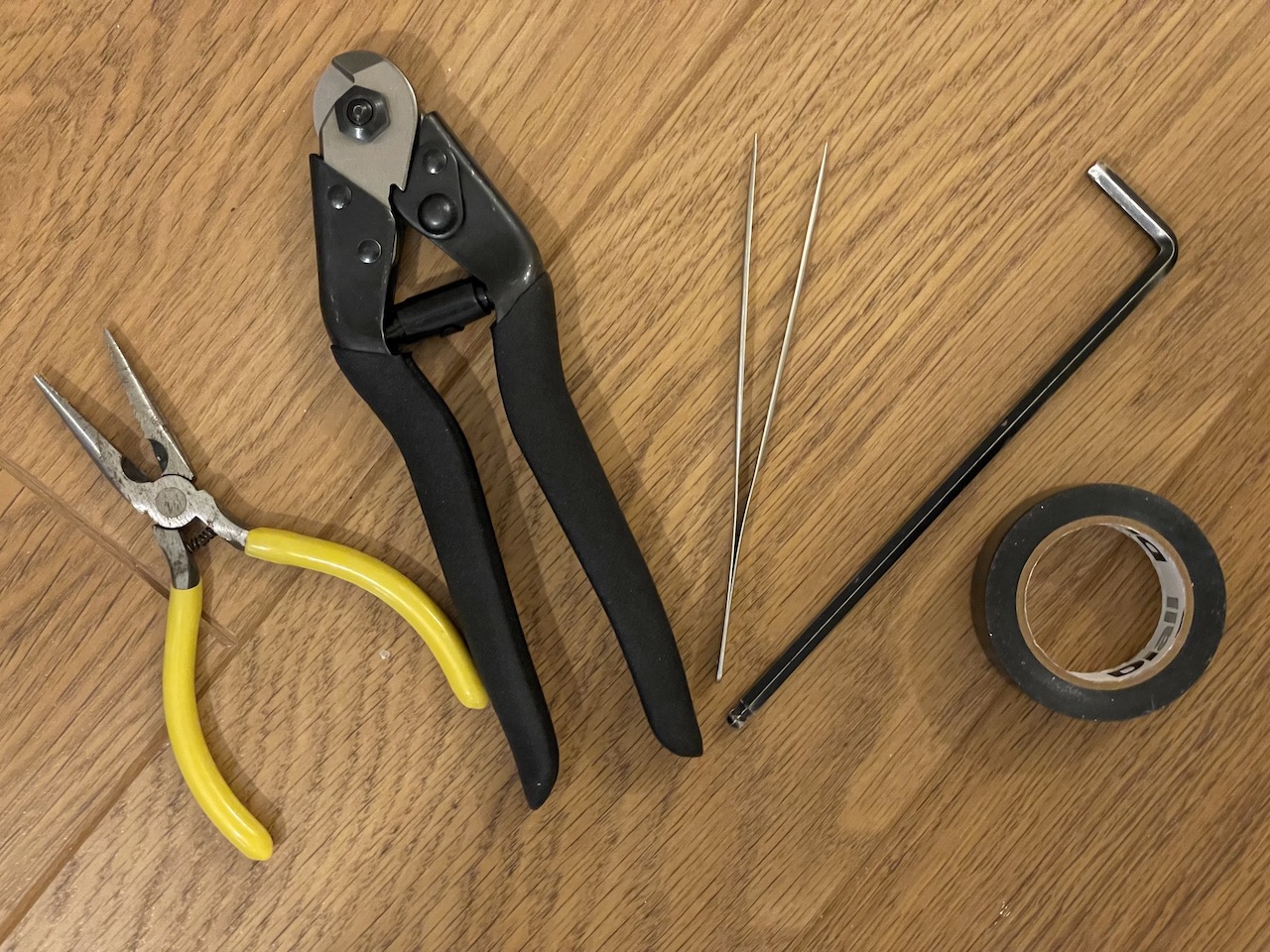 In addition to the cable cutter specifically ordered, a number of handy tools plus electrical tape were also required to complete the work. The electrical tape would be used to tie the brake/shift cables to the handlebar and fix the ends of the handlebar tape.