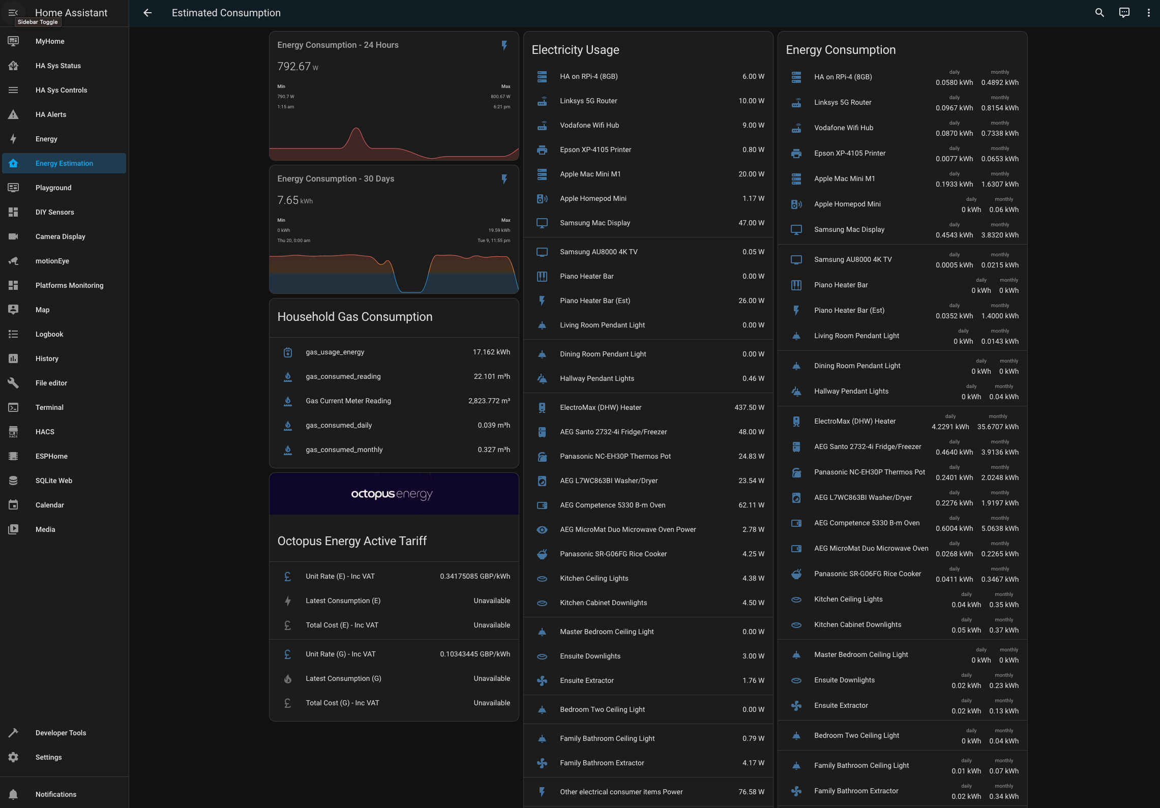 The first group can be directly monitored by Home Assistant, while energy usage for the second group can be calculated based on its equipment state using YAML definition. Finally, the third group can only be estimated through YAML definition. The last two groups rely on accurate energy measurement during normal usage and having a good Power Meter is definitely helpful.